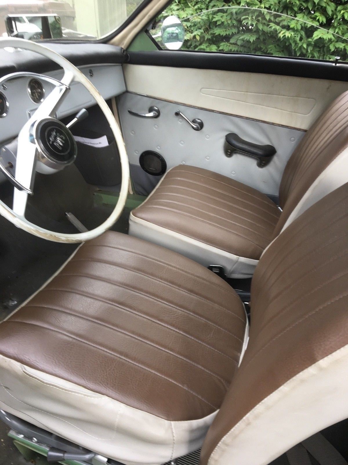 I love these. Saw a 95 (wagon) in this same color on a rainy day in Boston just a couple of weeks ago! (And I mean, in the city!) Mine was a ’68 95 with the V-4 engine. It was a great little car. That door panel looks original to me. Mine looked just like that with the funny little circles. (No speaker though.)