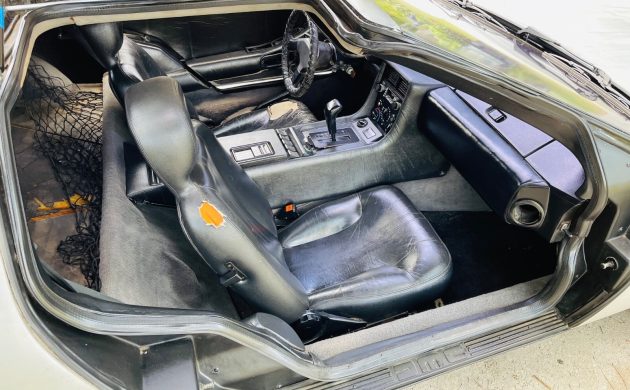 In 1981, this car came in two interior colors: black and silver. This one has a black vinyl interior, which is reportedly in good condition except for a chunk of the seat that can be seen that is missing from the passenger seat and wear on the driver’s seat. The DeLorean was offered with either a 5-speed manual transmission or automatic transmission. This car has the automatic transmission which by most reports is less favorable than the manual option. The seller states that the car will not go in park so they leave it in neutral. The description of the car is lengthy to the credit of the seller and mentions all the problems with the car, including rust, that they are aware of.
