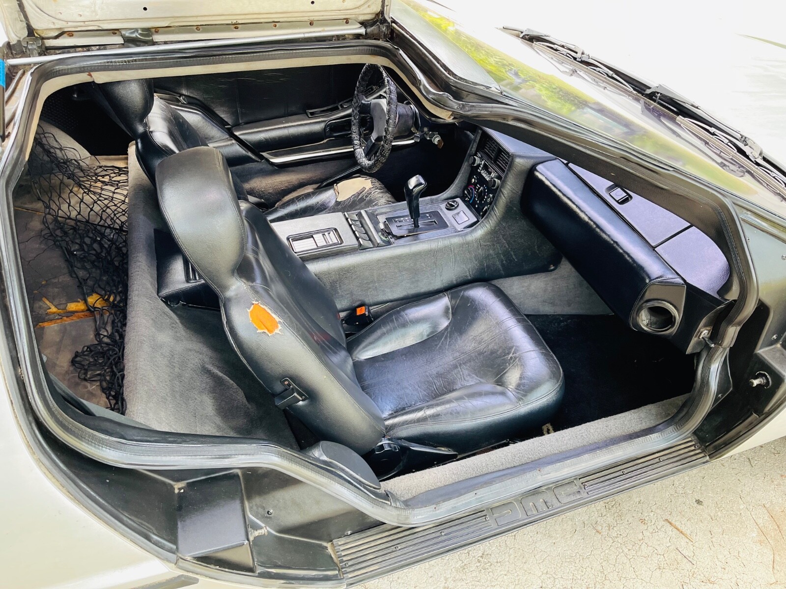 In 1981, this car came in two interior colors: black and silver. This one has a black vinyl interior, which is reportedly in good condition except for a chunk of the seat that can be seen that is missing from the passenger seat and wear on the driver’s seat. The DeLorean was offered with either a 5-speed manual transmission or automatic transmission. This car has the automatic transmission which by most reports is less favorable than the manual option. The seller states that the car will not go in park so they leave it in neutral. The description of the car is lengthy to the credit of the seller and mentions all the problems with the car, including rust, that they are aware of.