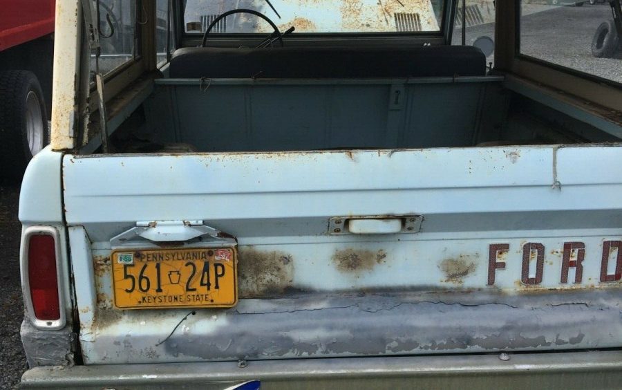 The interior is pretty no-frills as is pretty common with first-generation Broncos. There is no back seat and it appears that the bed has been used to haul quite a bit. The seat cover doesn’t look original, so hopefully, it is hiding nice original upholstery and no surprises. A good cleaning and I’m confident the dash would look great.