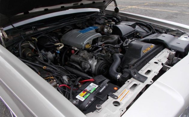 Interiors were well equipped not but not necessarily luxurious. Still, you got some handsome fake wood trim on the dash, a driver’s side airbag, full power including the front seats, and a padded dash top (it looks like this one has some upgraded factory speakers as well.) About the only thing that could make this cockpit better are some upgraded floor mats; the old, factory rubber coverings let the clean cockpit down. Three-point seat belts became standard, along with tilt steering, automatic headlights, and air conditioning. Despite having over 90,000 miles, the seat upholstery appears to be excellent condition.