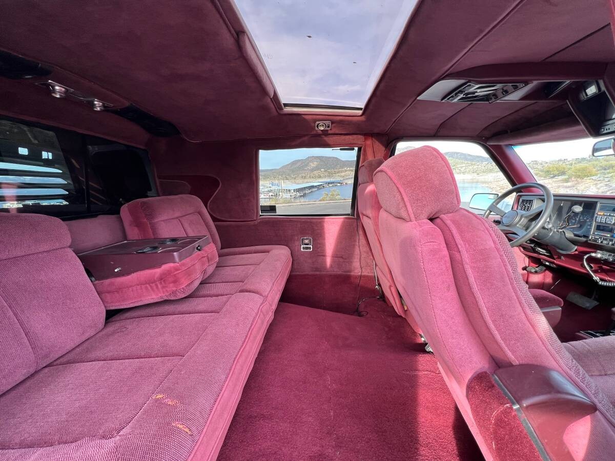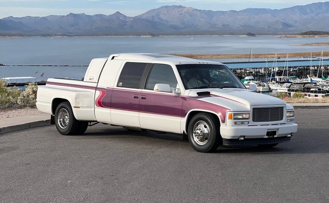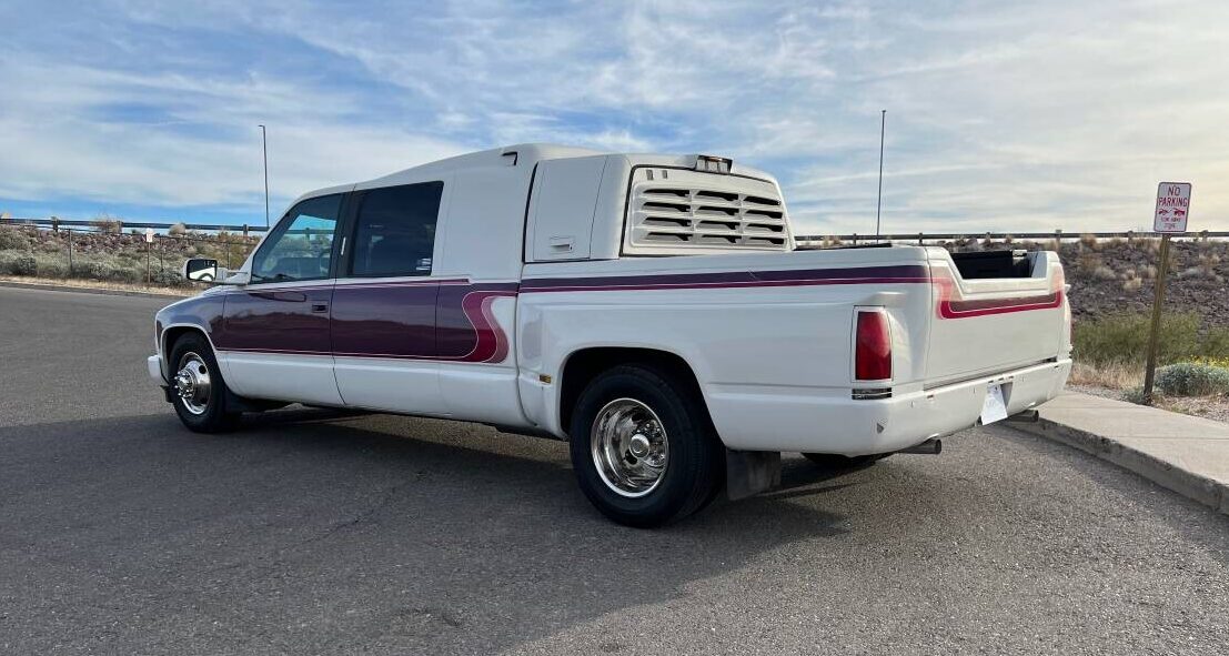 The huge interior has a limo-like backseat with a huge center console and cupholders. There’s a gaping moonroof up above and rear passenger compartment windows on both sides. It appears that there’s a handle on the outside on just the passenger side, which makes sense considering that’s the curb side of the truck. The interior looks surprisingly factory in terms of appearance, with the correct upholstery and carpeting used for a 1980s GM product. The listing confirms the one-off truck was “….built off of a custom frame that started off as a 1980’s Chevy dually to make this longer for the mega cab and body kit.” The body kit, by the way, is a claimed one-of-a-kind fiberglass job.