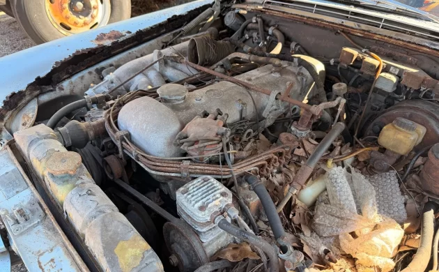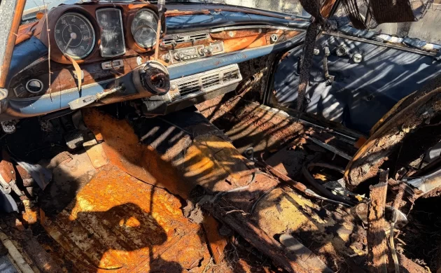 Amazingly, the Rudi Klein car appeared to have a slightly better interiorĀ andĀ the added bonus of a rare manual transmission. The interior of this 300SE is utterly trashed with the seats non-existent and the dash basically a throwaway piece with the exception of the gauges. Our subject car does have something going for it that the Klein car didn’t, which is the presence of the valuable European-market headlights – but I’m guessing the inner bowls are trashed with no reflective material left, so really, the value may be moot at this point. While there’s extensive surface rust present, it’s hard to say for sure if the floors are rotten – but it seems likely.