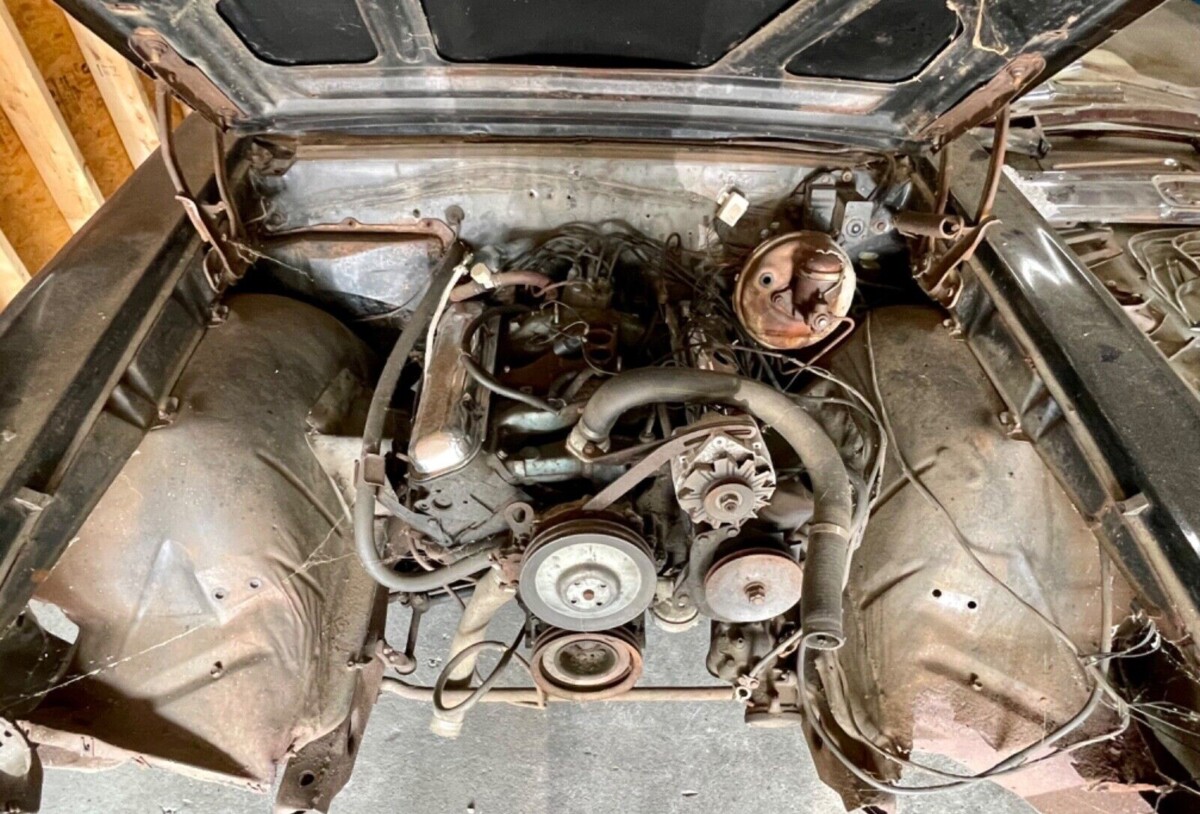 While there is some rust, the seller says it’s minimal and that the body is in generally good shape except for the bang-up to the front clip. It’s wearing Starlight Black paint which is offset by a Parchment vinyl interior. The key pieces under the hood are original and numbers-matching, including the 2-speed automatic transmission. Some paperwork follows the car to its next home, including the Protect-O-Plate and owner’s manual. This looks like an opportunity where you could sell off the excess pieces after completing a restoration.