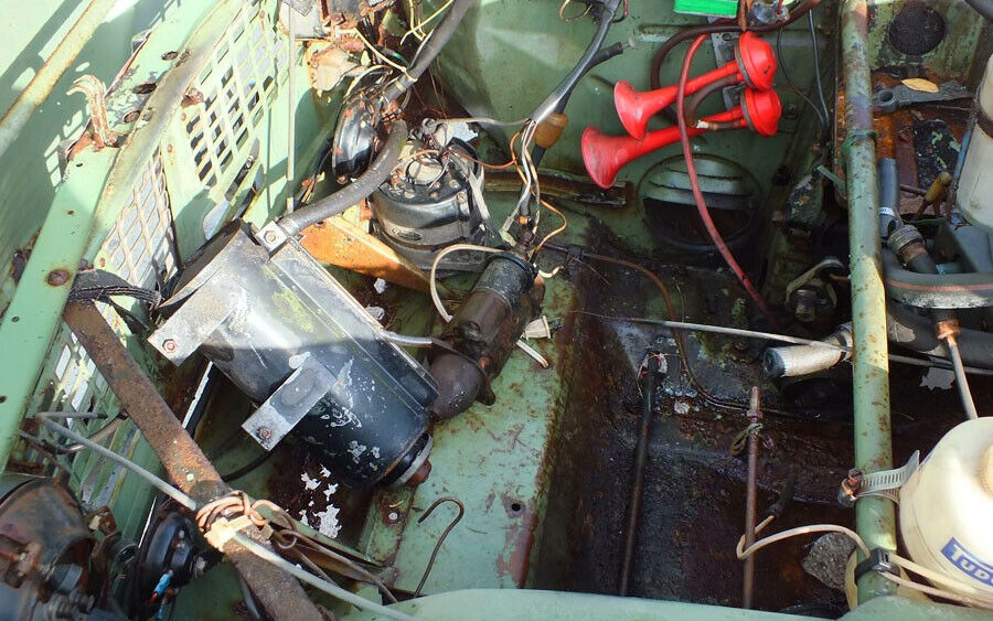 Here’s the… hey, where’s the engine?! Ok, here’s a photo of it in all its 841 CC, 38-horsepower glory. Between the Saab three-cylinder, Subaru Justy three-cylinder, and Yamaha XS750E three-cylinder, that’s why I have a 3-cylinder icon under my name, in case anyone was wondering. This car is missing the radiator, distributor, and fan and you can see that it needs an incredible amount of work. Can this Saab 95 be saved or is it a parts car at this point?