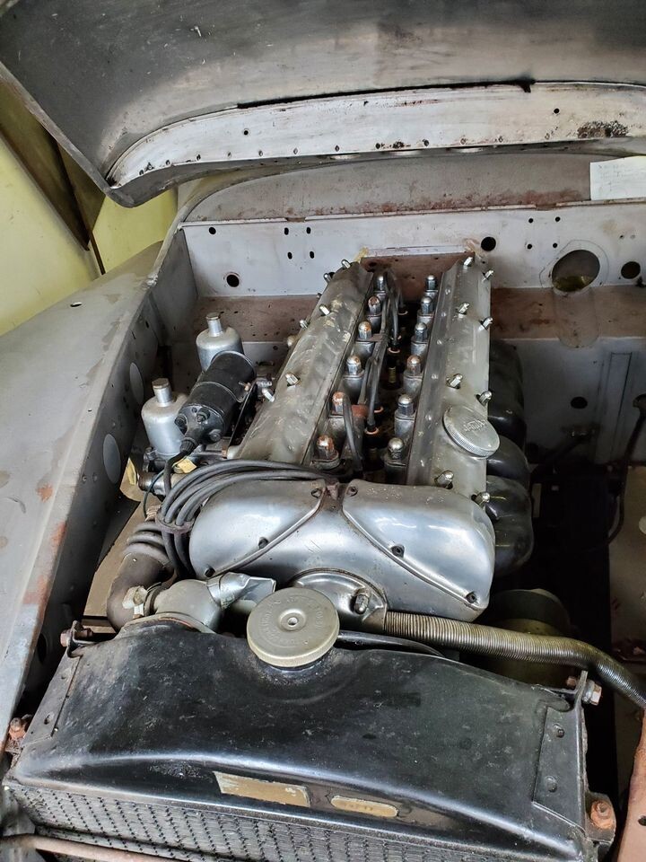 The installed engine number matches the VIN plate; no word on its condition. The engine is the famous 160 bhp dual overhead camshaft 3443 cc in-line six-cylinder coupled with two SU carburetors and a four-speed transmission. The top speed was an honest 120 mph, thus “120” in the name. The seller says this motor has early “studless” cam covers, which are not actually studless but don’t have the last three holes drilled; these are notorious leakers which is why they were re-engineered. I have seen a couple of versions of these – sets with the indents present but not drilled, as on the right in this link, and others with a completely smooth boss. The seller also indicates he has another motor for the car but does not say if it comes with the sale.