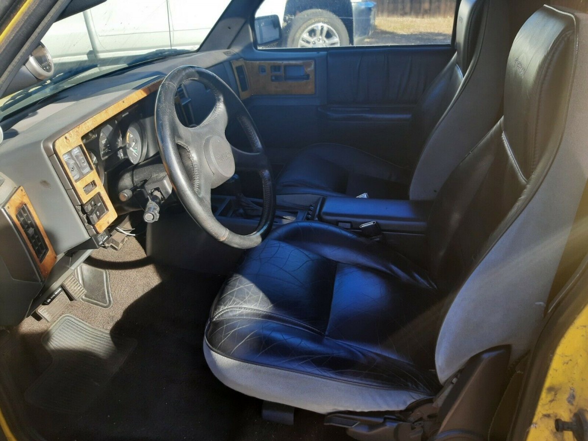 In double-checking that there wasn’t, in fact, a factory Typhoon offered in yellow, it confirmed that this particular truck has likely been floating around for a few years as a hopped-up example. There are some indications it used to have a cowl induction-style hood if the one I spotted is, in fact, the same, along with the clear taillights you see here. The respray was complete, at least, going into the door jams as well as under the hood. The interior is in driver-quality condition, with some fake wood trim lining the perimeter around the dash fascia and the door handles. The leather seats at least appear to be untorn, and I can’t see any cracks in the dash.