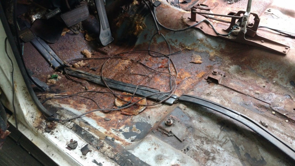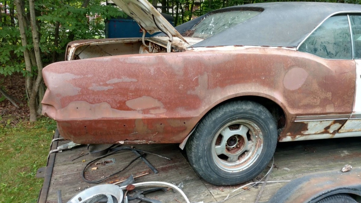 The interior is largely complete except for part of the rear seat, but it will need a full restoration. The dash pad has a crack, but desirable items such as the floor console are present and appear to be in good, restorable condition. You can see the rust in the quarter panel in the above shot, and this appears to be the worst of it. The rockers look to be solid.