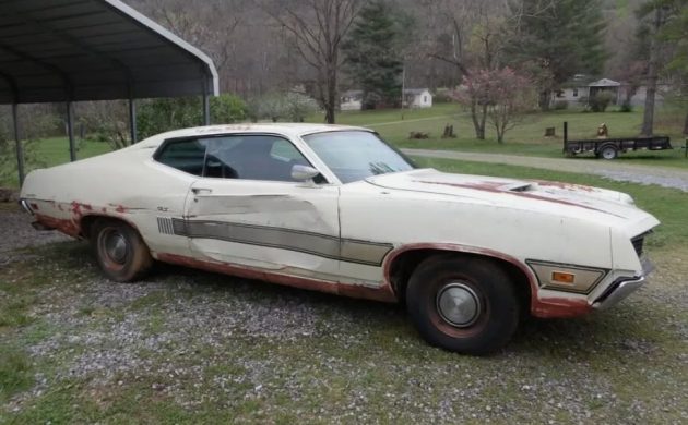Ford introduced the Second Generation Torino for the 1970 model year. It enjoyed a two-year production life before being replaced in 1972. This GT is a first-year example ordered by its original owner in Light Ivy Yellow with distinctive laser stripes. The seller confirms that it has hibernated since 1983, only recently emerging into the light of day. The first thing to note is the significant dent in the passenger-side door, which was inflicted by a tractor while the car was parked. It appears the damage is cosmetic because, with the door opening and closing as it should, there is no damage to the pillar or door frame. The faded paint is an indication that there could be deeper problems, although these may not be extensive. The seller confirms the presence of rust in both the front floors, one lower rear quarter panel, the trunk lid, and the trunk pan. However, it seems that one section of the floor requires replacement, with the impression given that patches might be a viable solution for the remaining shortcomings. The underside shots reveal plenty of surface corrosion, but the rails and other structural areas appear rock-solid. The rocker moldings are the only missing trim pieces, and the tinted glass looks nice.