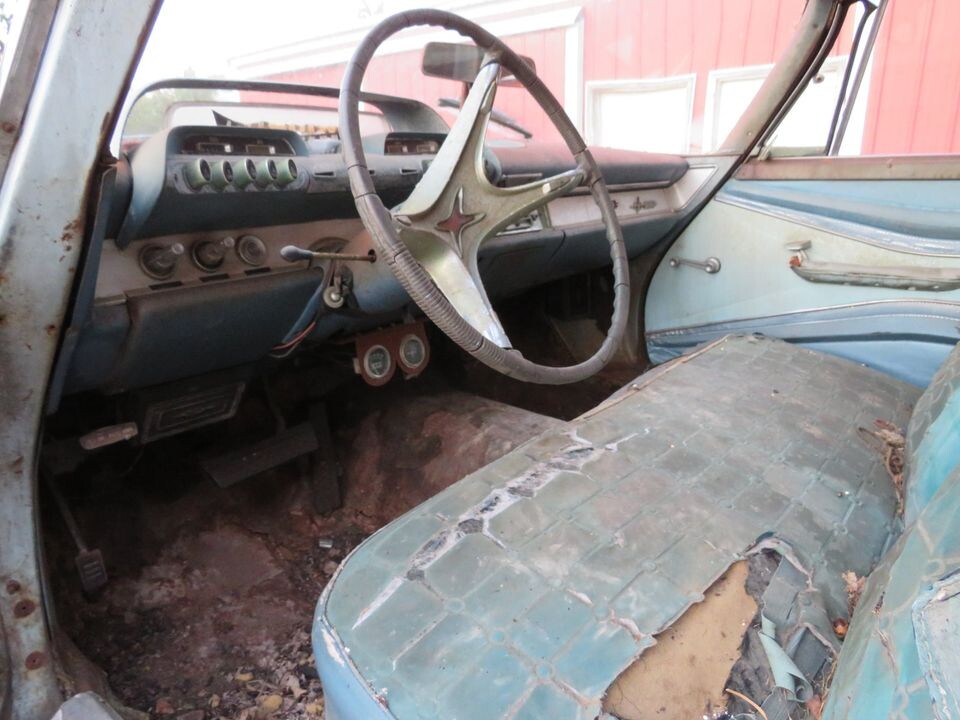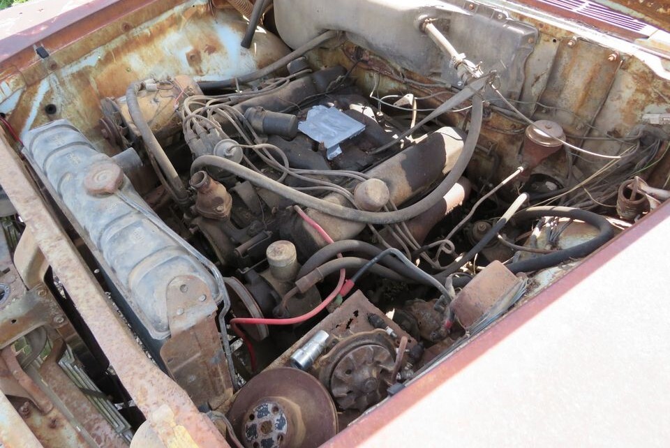 These cars were a continuation of the styling excesses that Virgil Exner became noted for in the late 1950s. The Matador sports “half” fins with jet pod taillights mounted at the ends, and it has a speedometer with a see-through gauge and push-button automatic transmission controls. All in tune with the Jet Age that was the late 1950s/early 1960s. Besides missing the carb, this car is devoid of its air cleaner, and the water pump has been disassembled. Maybe the 4-door parts car will help with the restoration, but it has no engine or title.
