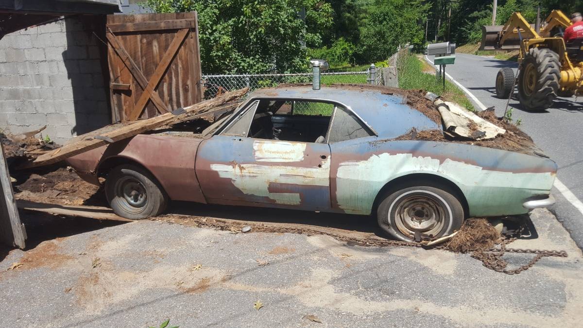There is a chain hanging off the back and s front loader parked on the street. This is likely a shot when it had just been dragged out. The other shot shows the roof of the garage, it suggests there are structural issues which helps explain the debris lying on the Camaro.