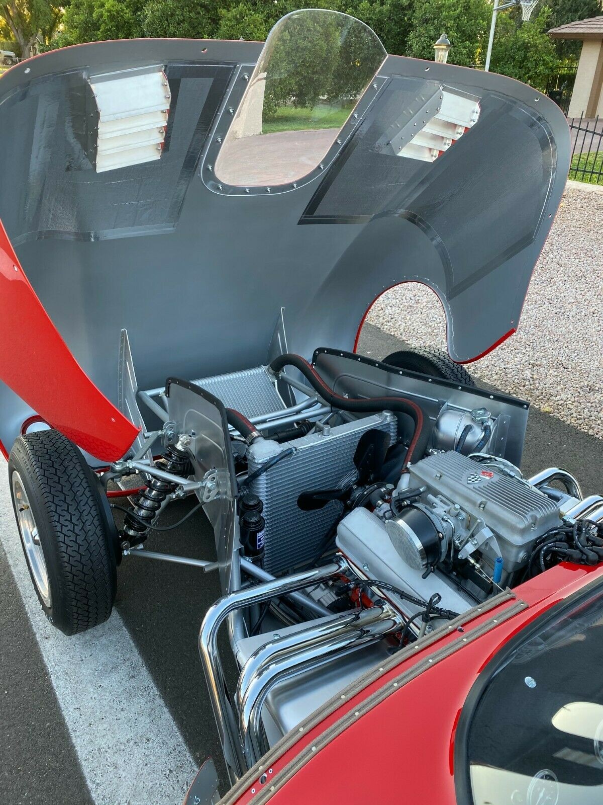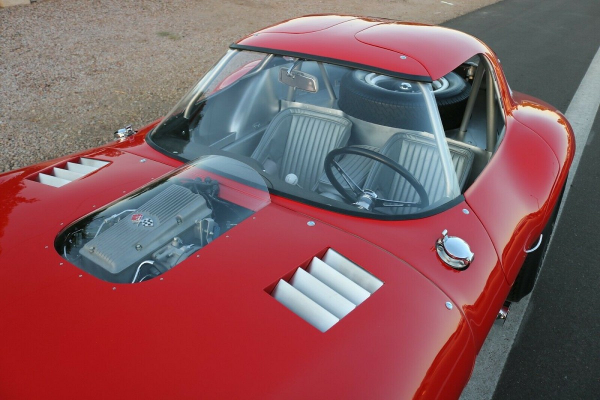 The engine powering this lightweight beast is a 1963 Corvette 327 cubic inch V8 engine. The RF code motor is fuel injected and rated at 360 gross horsepower. The engine transfers all that power to the Corvette IRS 3.36 rear gears using a Borg-Warner T10 4 speed manual transmission. The car has triple fuel tanks, two custom radiators, and 4 wheel coil-over shocks. Even though it is a race car and a prototype, the car has functional headlights and turn signals. Stopping power is controlled by vented drum brakes on all four corners.
