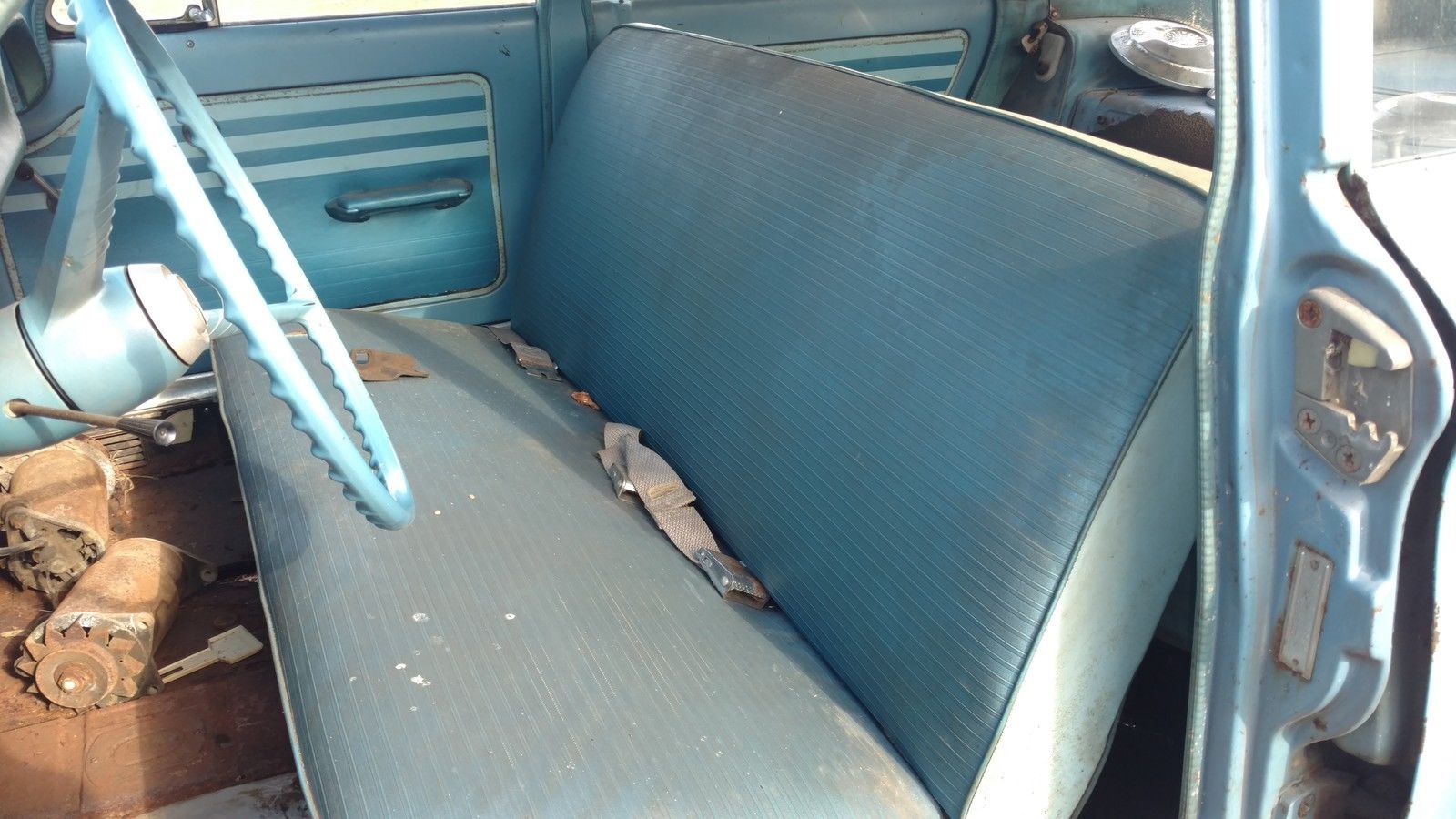 I’m pretty sure you are looking at the original paint as well, which means you can see all the damage without any being hidden. The interior looks like you could clean most of it up and leave it as-is apart from the carpet. The seller tells us Pugsley has 60,300.5 miles and has been off the road since 1973 or 1974 and has been stored in a barn since then. There have been some previous (non-original type) floor repairs and another small one is needed in the rear floor. There is also some rust in the front cross member that can either be repaired or replaced.