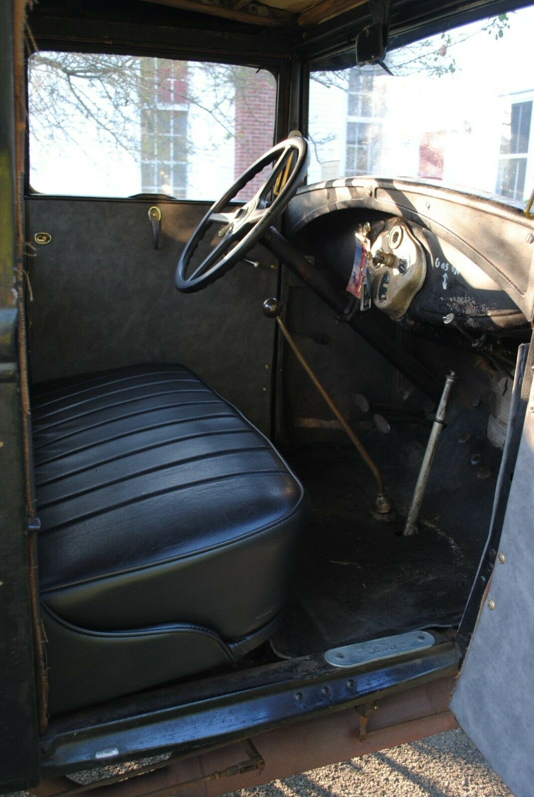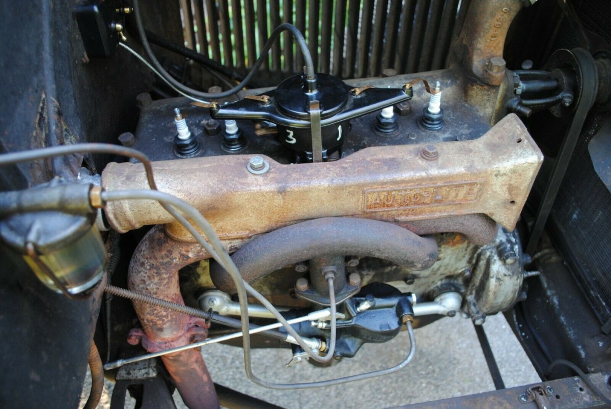 This four-cylinder engine is connected to a manual transmission. Recent updates have been made including a new wiring harness, new cap, rotor, plugs, and a rebuilt distributor. It is a six-volt system. The harness is from Mikes A Fordarble. A new battery has also been put in, the carburetor has been rebuilt, and the brakes have been worked on. The listing says that it runs, drives, and shifts without any issues.