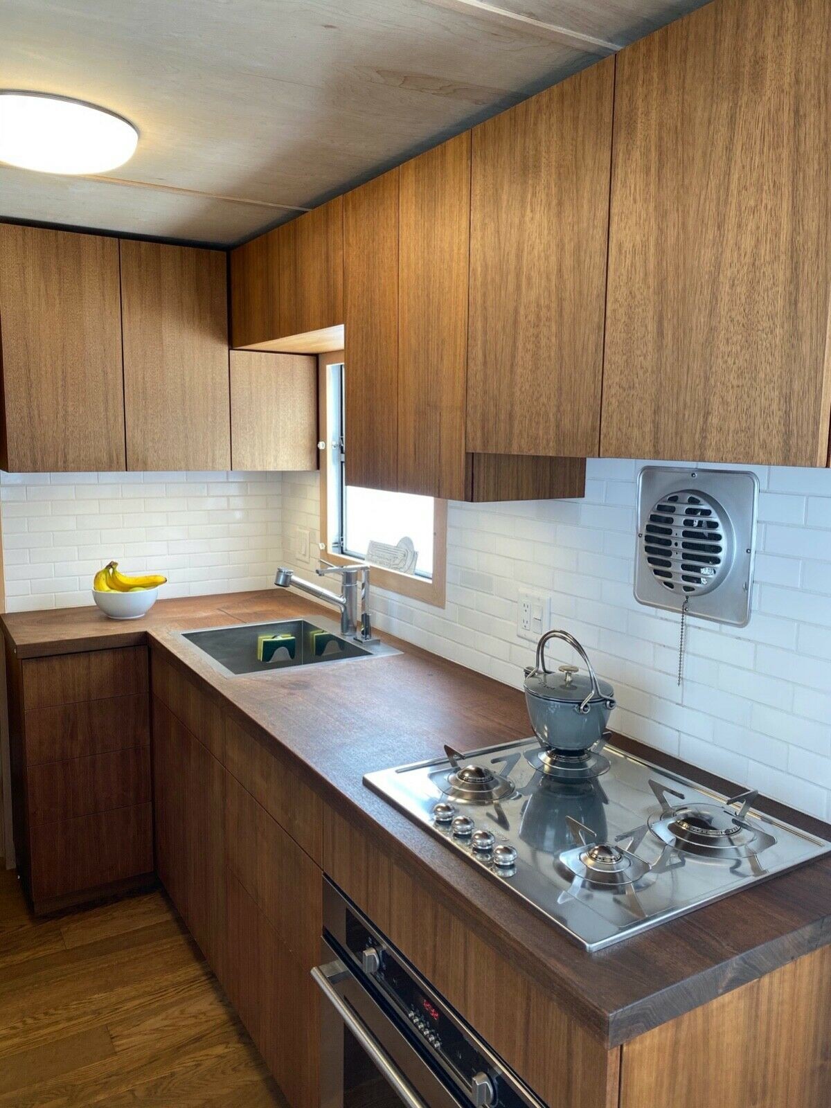 What a kitchen. It is fully appointed and would rival the kitchens in most family homes. It features a full-sized stainless steel refrigerator, along with a full-size stove. The kitchen cabinets have been custom-built, while the counters are made from solid slabs of walnut. There should be more than enough cupboard space, while all of the wiring is new throughout the trailer. There’s an extraction fan above the cooker, which should mean that cooking smells won’t have a chance to linger once a meal is prepared.