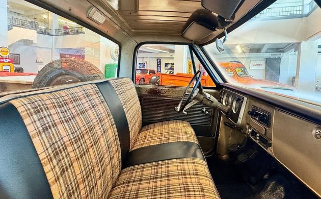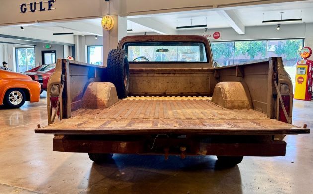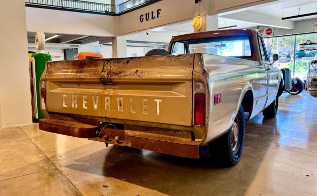Today’s subject is the less popular long-bed version of Chevrolet’s always-in-demand C10; apparently, the big money is with the short-bed version. There’s enough of a value disparity that some restorers have made their mark by converting long-bed trucks (127″ wheelbase) into the more valuable shorter-bed variety (115″ wheelbase). The seller claims that this C10 is a two-owner truck, and adds, “It’s a true Southern survivor that’s never been over-restored or disguised; what you see is the real deal.” As for its obvious patinaed finish, we’re told, “The factory Saddle paint and solid Fleetside body give this truck an irresistible patina – the kind that can’t be replicated with paint. It’s not perfect, and that’s exactly why people love it.” OK, so this one’s not wearing a “manufactured” look, but I gather its originality has been preserved with clear coat. Structurally, this truck shows well; no noted indication of rot is evident, though there is a Bondo patch in the lower passenger side of the cab. Fortunately, the cargo bed reveals just some surface rust and nothing more invasive than that – originality does abound!