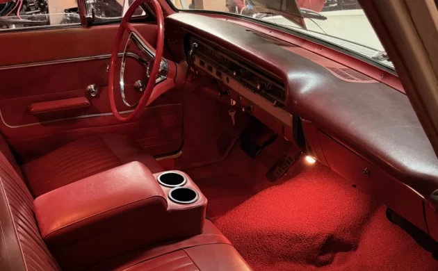 The interior is in excellent condition, with tear-free seats and headliner (and new carpet). The red vinyl is an excellent complement to the white exterior.