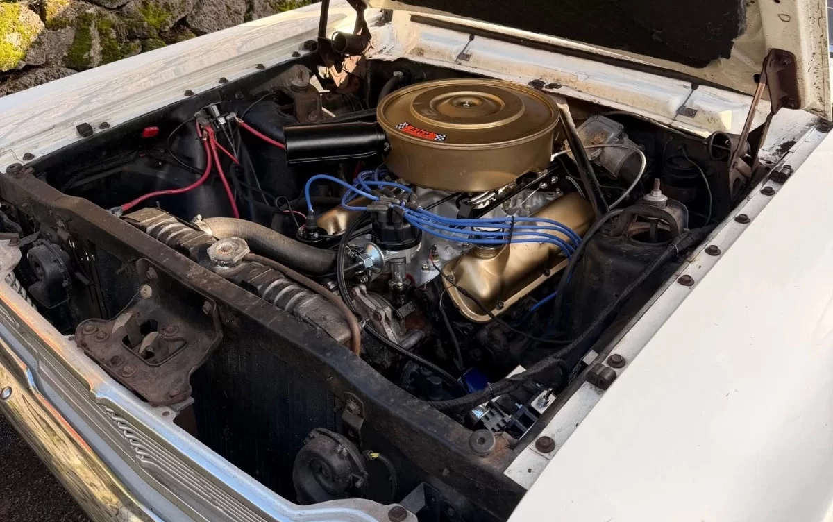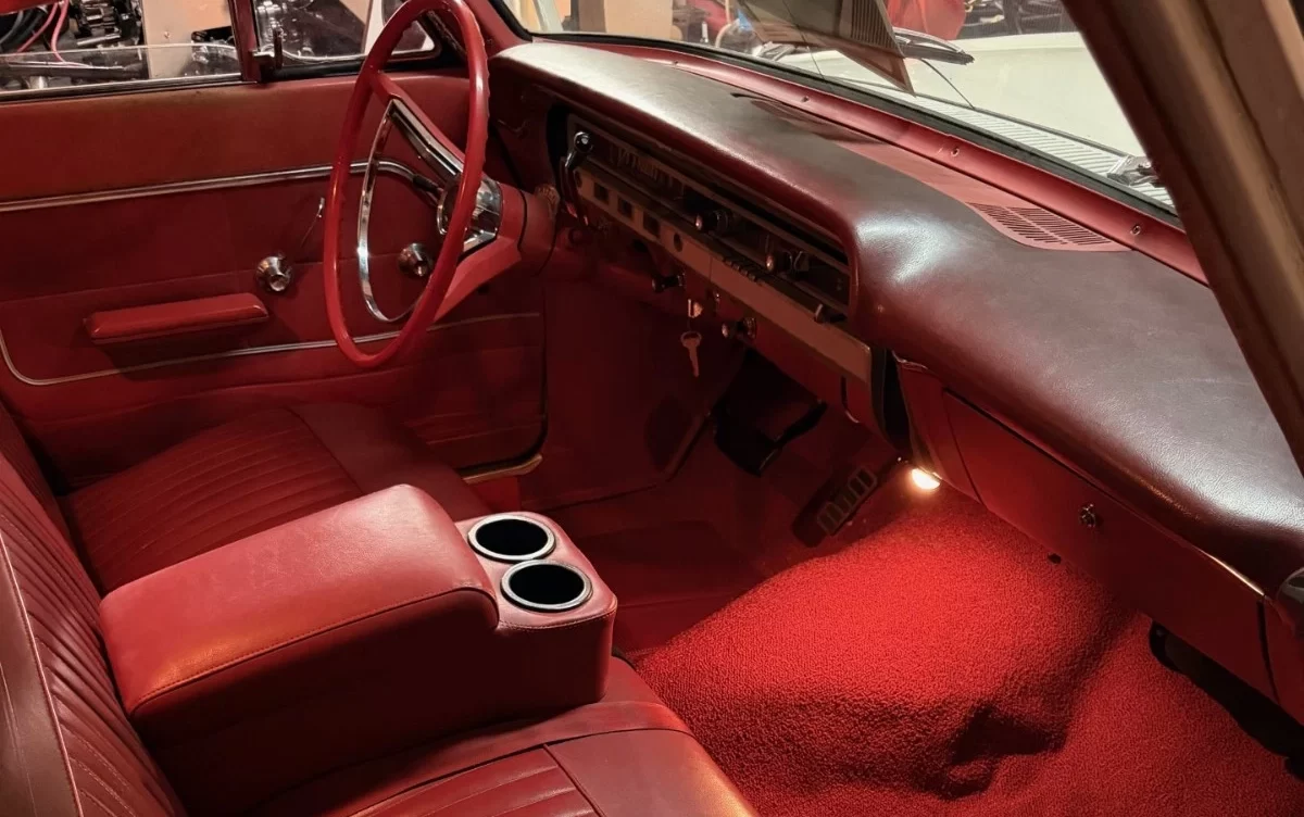 The interior is in excellent condition, with tear-free seats and headliner (and new carpet). The red vinyl is an excellent complement to the white exterior.
