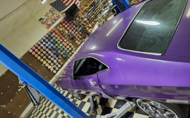 We’re told the Ford is a driver, but all the photos are in the garage and parked over/under the car lift. The engine is original, which the seller questions — do the mods still qualify it for numbers matching? It was a 4-speed car, and the seller says that it comes with the sale (a Tremec 5-speed is currently installed). This was a Special-Order vehicle with boxes checked for a police handling package and power windows that still work. Factory A/C was also ordered. The engine has been stroked, so what is the displacement now?