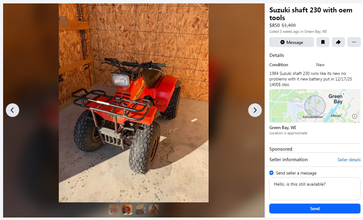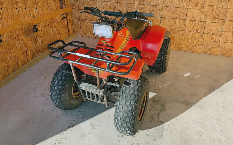 Kudos to the seller for removing the perfect-looking seat in order to show part of the engine that’s hiding under it, and under the cladding. It’s a Suzuki 229-cc SOHC four-stroke single-cylinder sending power to a 5-speed manual transmission with a clutch, to the rear wheels. This one also has reverse, a very handy feature if you’ve ever dragged a 300-pound three-wheeler out of your storage unit. Hey, maybe that’s why my arms are so huge?! (crickets). They say it runs like new and has a new battery. This could be a nice first quad for almost anyone who isn’t into racing. Have any of you owned a 1980s Suzuki four-wheeler?