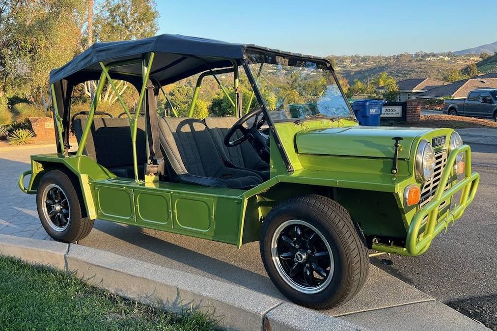 BMC initially developed the Mini Moke as a military vehicle. Its flat fender tops and the fold-down windshield made it ideal for stacking in ship holds, which was one of the company’s key selling points. Sadly, the military demanded simple mechanical components and good ground clearance, but the Moke failed to deliver on both. Production eventually shifted to Australia in 1966, with the last cars leaving the Zetland Plant in New South Wales in 1981. Sales were far lower than anticipated, motivating Leyland to release the Californian variant in 1971 to improve the situation. This 1978 example is one of those cars, presenting well in Green Metallic. It is worth noting that the company never offered a Californian in this shade, and the engine bay suggests it originally wore White. It is missing key components, like the distinctive white 13″ steel wheels, the “Californian” decals on either side of the hood, and the floral soft-top. However, it retains the correct front “roo bar” that replaced the standard front bumper. The photos reveal no evidence of rust, the panels are straight, and the overall presentation is comfortably acceptable for a driver-grade classic.