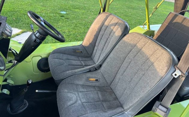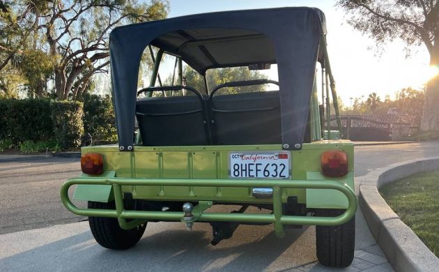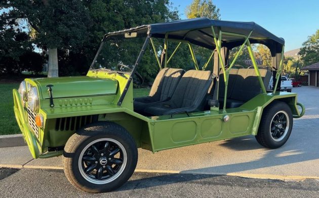 The British military’s desire for easy maintenance wasn’t satisfied by the Moke’s Mini mechanical components. The 10″ wheels provided limited ground clearance, and the lack of a four-wheel drive option probably proved to be the final nail in the coffin. BMC attempted to address the four-wheel-drive issue by building a prototype with engines and transaxles at both ends. They linked the pair using “common” components such as throttle cables, shifter shafts, and clutch mechanisms. However, this complex solution was unacceptable. The Australian Moke was available with two engine choices, and this car’s first owner selected the 998cc BMC A-Series four. It sends its 39hp and 50 ft/lbs of torque to the road via a four-speed manual transaxle. It is worth noting that while the Moke Californian is rare, the Mini drivetrain means its mechanical components are readily available. The seller upgraded this Moke’s braking system with Mini front discs and recently installed new Bilstein shocks. The vehicle drives well and is ready to hit the road with a new owner behind the wheel.