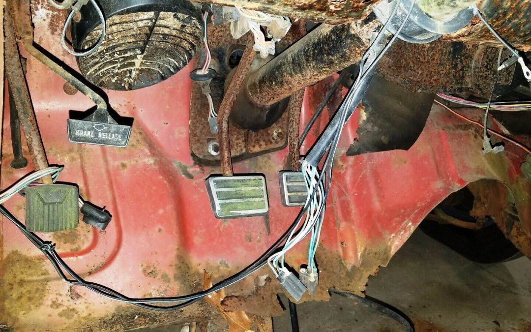 Our best view of the interior comes from this image. The small brake pedal and companion clutch make up the only good news here, as this body seems to have rusted from the ground up with no signs of stopping. It goes without saying that the best buyer either has a donor car already or plans to find one.
