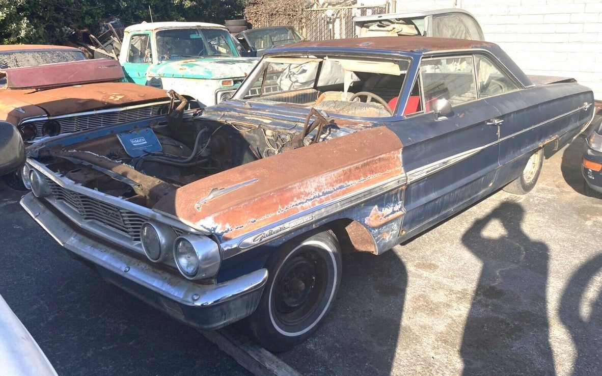 Gear-heads yearning to unleash the power of Ford’s 1964 NASCAR entry couldn’t get much closer than a 427-powered four-speed Galaxie fastback. This 1964 Ford Galaxie 500 XL in Pacifica, California left the Twin Cities assembly plant in Saint Paul, Minnesota with the hot R-code dual-quad 427, bucket seats, and a four-speed floor-shifted manual transmission. Amazingly, the original block remains, though sadly with a hole in its side. The listing here on eBay asks $11,250 for the car as it sits, and a Make Offer button if you’re feeling lucky. Thanks to reader Larry D for spotting this abandoned blue beast.