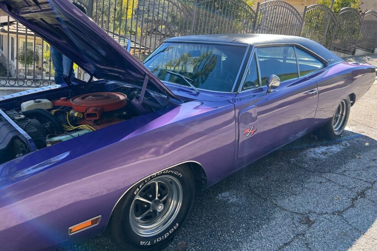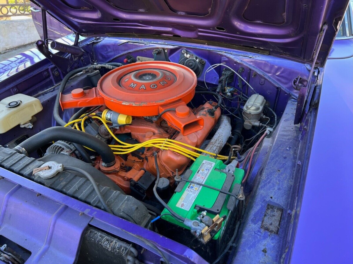 well it’s not a real R/T, 318 car, but it is a factory FC7 plum crazy I can’t tell about if it has the right shade of purple and hard to tell if the interior is original but it does look like the carpet is and also the vinyl top is because you can see the top has cracks and is very dry, the thing is that it coast just about as much just about as much to restore a 318 car as it does a real R/T so why would anyone want to buy a clone, not a bad car but not for me!