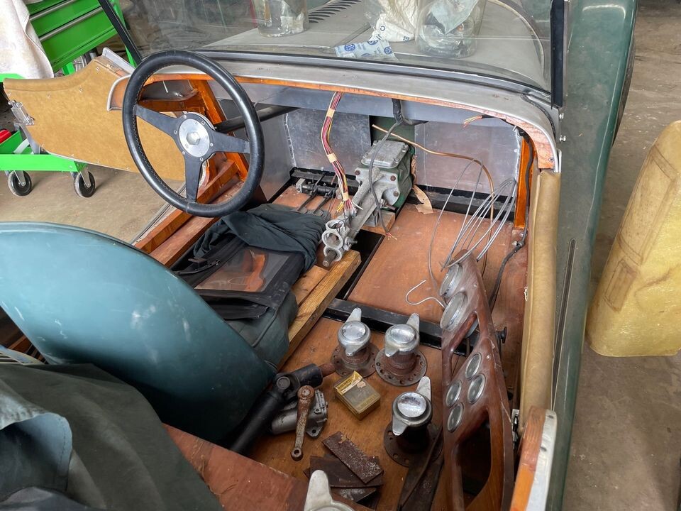 The interior is a work in progress. The dash and side curtains are with the car, but no doubt getting this car over the finish line is going to take money and time. These older British cars have several advantages though: they are simple as a stone, parts are plentiful, and club support is doubly plentiful. Best yet – Morgan is still in business today, which at least provides a cozy feeling if not some actual practical help.