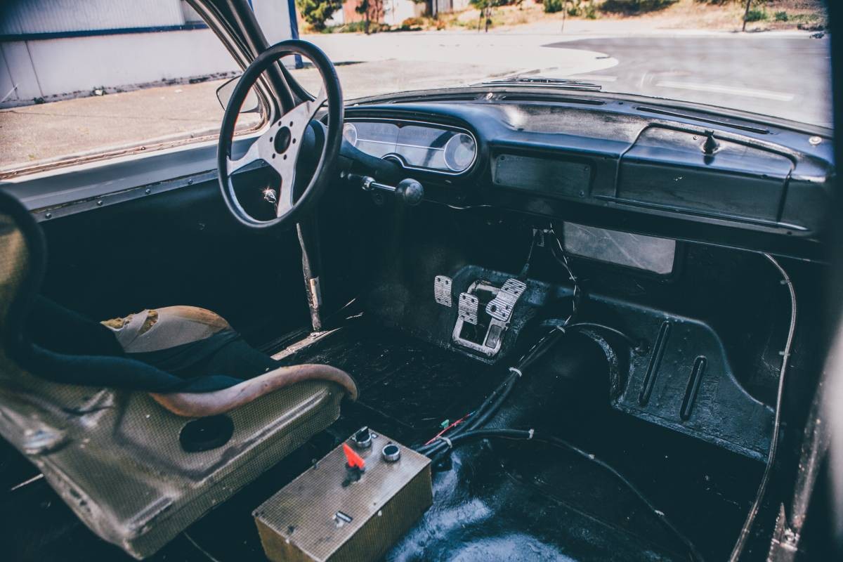 Interior refurbishing for a return to active road duty may be a bigger task, depending on the new owner’s ultimate aim for the car. With no interior trim, carpets, and only a single Sparco race seat, this is an out-and-out track car. The roll cage looks to be fairly sturdy, although I would want to check the rear attachment points to ensure that the welds were solid. The easy to reach switch-box is a great idea, while the whole idea of racing a car fitted with a column change really fascinates me. The interior is utilitarian, but perfect for racing duties.