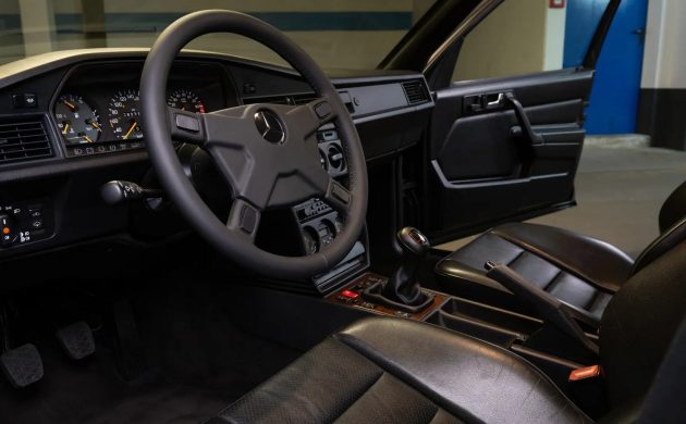 Although considered a homologation special focused on performance, the Evolution II’s interior still included plenty of creature comforts. Apart from the beautiful Antracite leather trim, this car features air conditioning, power windows, power locks, heated power front seats, and an updated stereo. The only other addition is the sports wheel, though the seller includes the original for those who prefer authenticity. This 190 E isn’t a low-mile vehicle, with its odometer showing 80,000 kilometers (approximately 50,000 miles). However, the lack of wear and physical damage suggests it has been treated respectfully since Day One. Close inspection may reveal minor imperfections, but the overall impression conveyed is positive.