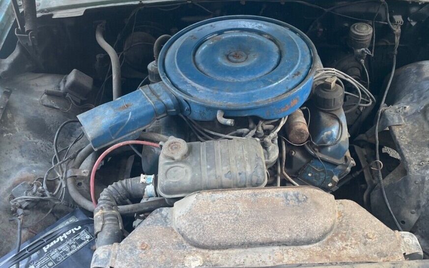 Power is provided by a 300-gross HP 390 CI V8 engine that does not run but will turn over by hand. It is said to need a starter and a fuel tank. The mileage recording is 79K miles but there is no authentication provided. The big FE engine is attached to an automatic transmission, likely a Cruise-O-Matic unit. Also mentioned is the need for brakes.