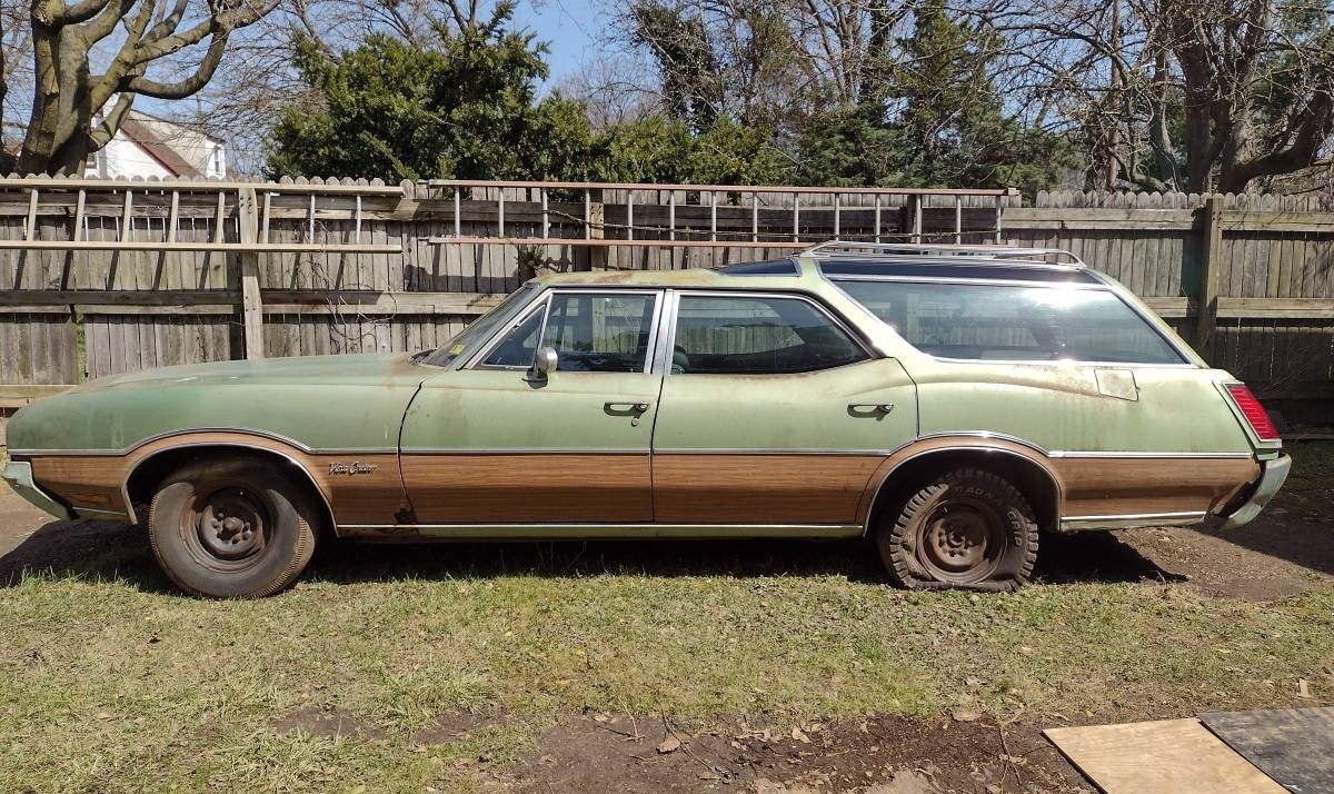 This non-running wagon is powered by an Olds Rocket 350 V8 and automatic transmission, the most common pairing in these products. This is a project car that likely has rust in key areas as some of the tires have been flat, exposing the car to the ground underneath. However, the all-important skyline windows are in good condition as well as intact; replacing those might be tricky. This is a 5-passenger wagon meaning there was no third seat. Bring a trailer with you along with the money and the seller will hand over the wagon and its title.