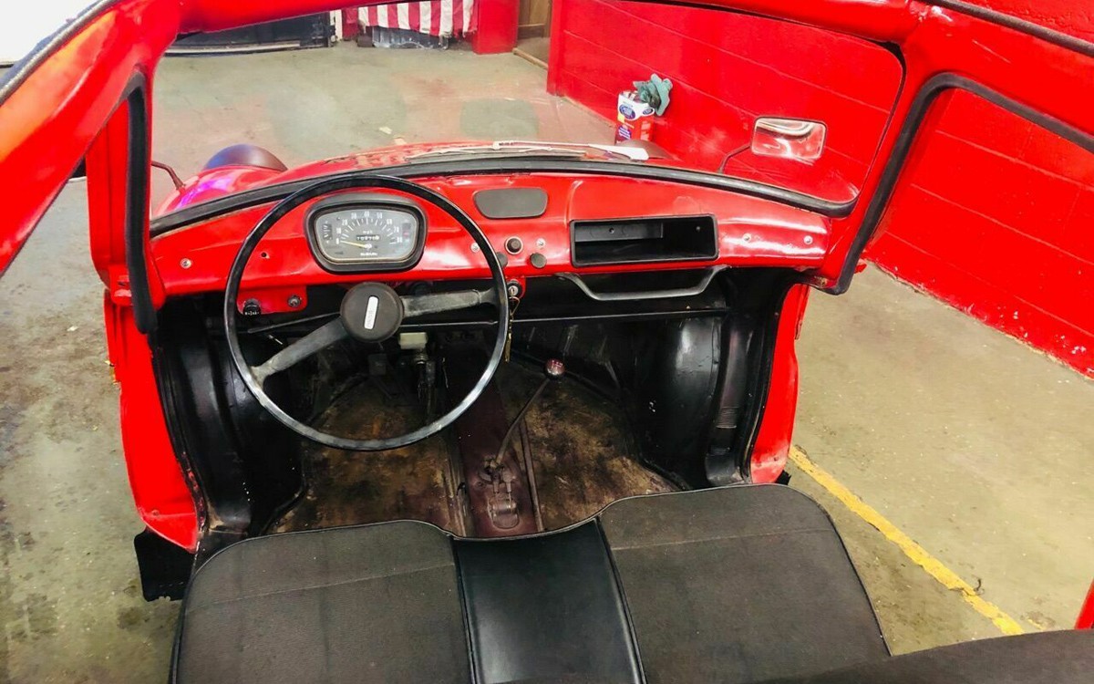 There is no back window and there would also have been a top, of course. Young S models had an indented hardtop in order to carry a surfboard on top (no lie), and there would have been a soft-top or hardtop on the Deluxe. The seller has a full snap-on soft top that goes all the way down over the space where the back window would be so it would be a scary and possibly illegal drive with that in place, unless you’re actually on a rally course. Wait, that would be even scarier! You’ve already noticed the wing on the back – most definitely not a factory piece.