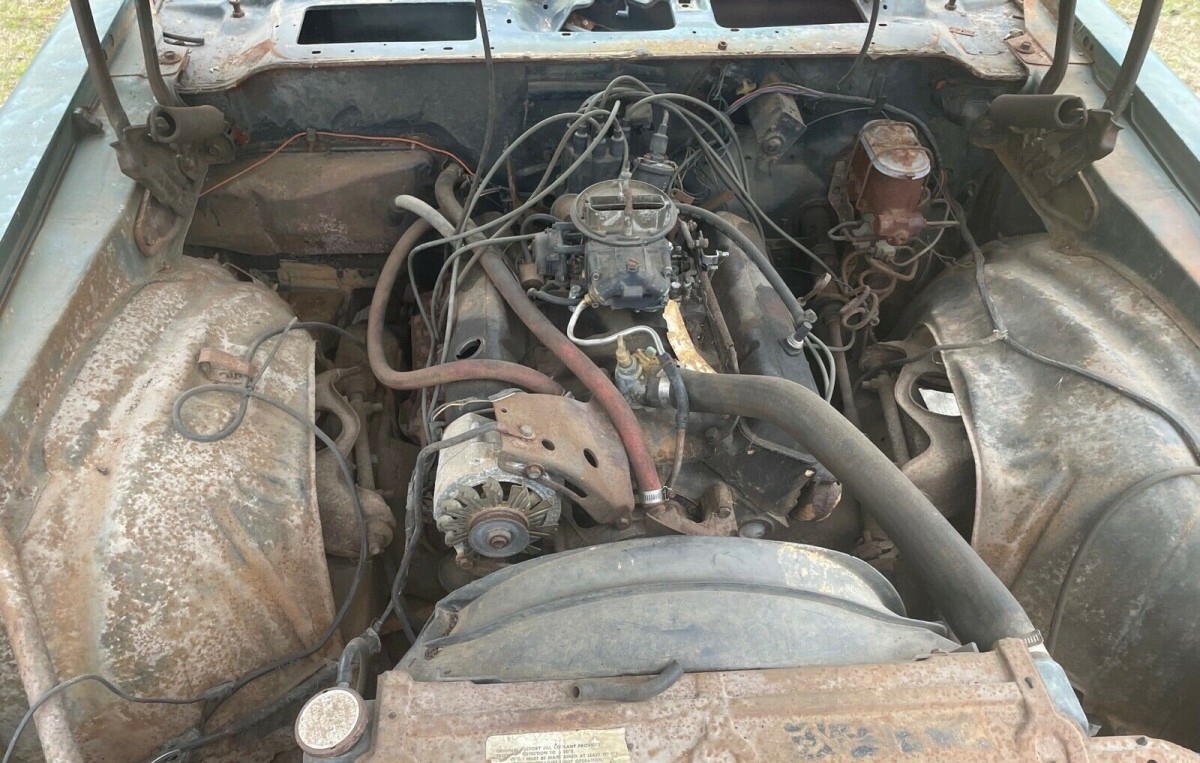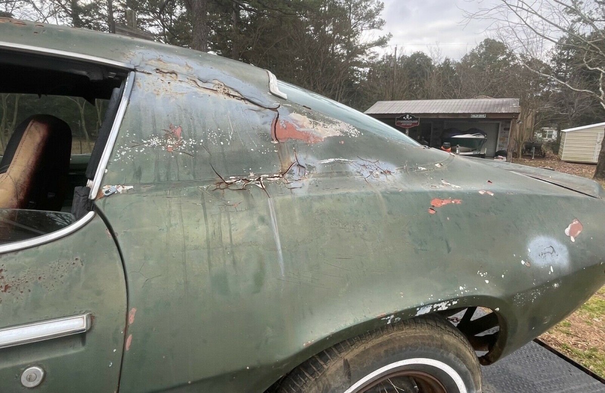 The Forest Green car once had a vinyl top, but that must have rusted so badly underneath that a new roof skin was needed rather than a repair job. Some of the filler material used is visible and cracking along the roofline. Rust has also gotten into the front floor pans, right front fender, rear quarter panel, and even the hinges on the trunk lid. The interior is fairly well decimated and new, correct front seats will need to be sourced.