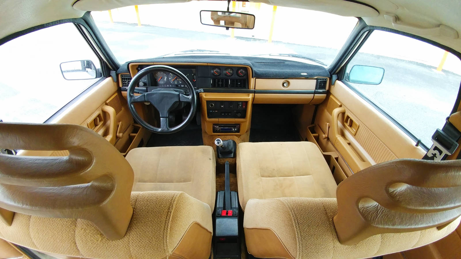 Inside you will find a bunch of rare parts that we scored from a local Volvo guy. That R-Sport steering wheel alone sells for around $400 online! Then there’s the auxiliary gauges and custom shift knob. We replaced the door panels with cleaner ones off a lower mileage car and installed cloth seats from a sedan. The headliner and back seat are in decent shape. Even the plastic door pockets are uncracked!