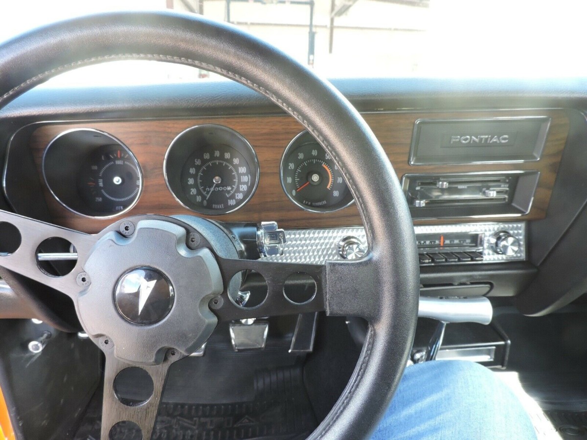 Painted it Orbit Orange, this GTO boasts a 370 horsepower Ram Air IV V8 engine. Although the block is not original, the Ram Air IV engine was the last of the round port high compression engines sold by Pontiac. It would be replaced by a lower compression HO 455 engine in 1971 in both the Firebird and GTO. With 10.5:1 compression ratio, the Ram Air IV engine used high flow exhaust manifolds and cylinder heads to generate 445 ft lbs of torque.