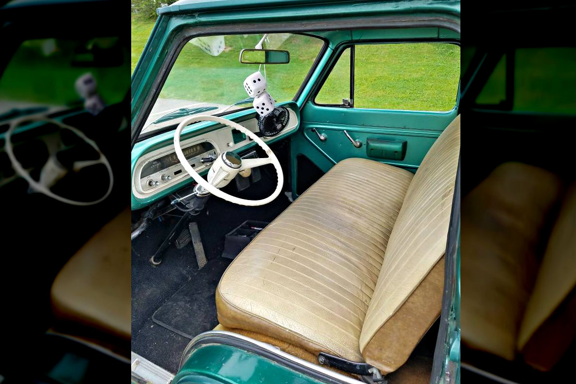 Inside you are welcomed by a very tidy interior that reflects little to no wear or aging. The door sills door jamb sections are in nice shape with no evidence of rust. Appearing comfortably broken in, the bench seat is in nice condition with only minor signs of wear. The paint in the cab is in excellent shape and there is really little to see in the way of flaws or damage. Someone has mounted a modern style fan to the dash, but hopefully it is attached in such a way that it could be easily removed. Overall this interior needs nothing other than a good vacuuming, and a new driver.