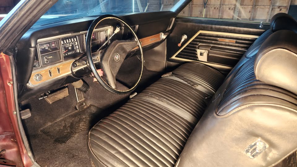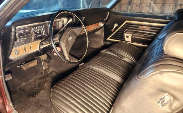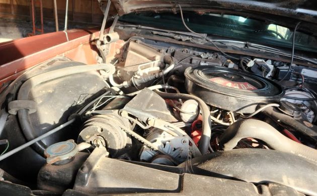 The Riviera’s interior was updated with woodgrain dashboard trim and a new steering wheel for 1969. Interestingly, although this one has an air conditioning compressor under the hood, it does not have power windows. The bench seat was a standard feature; the days of the Riviera being a bucket-seats-and-console-car only were long gone. The interior does look clean and tear-free, although the long slumber has certainly done nothing good for the interior’s smell.