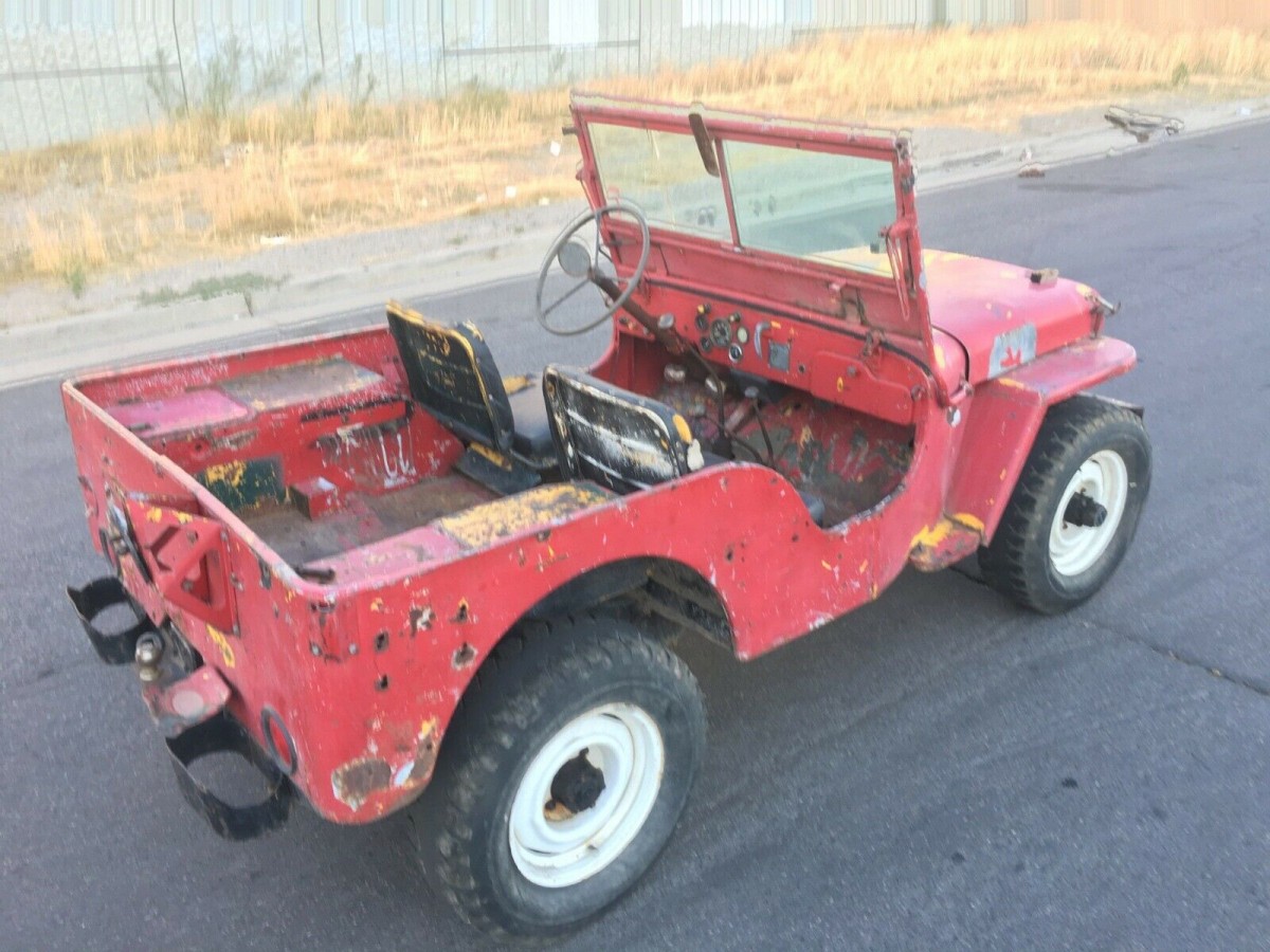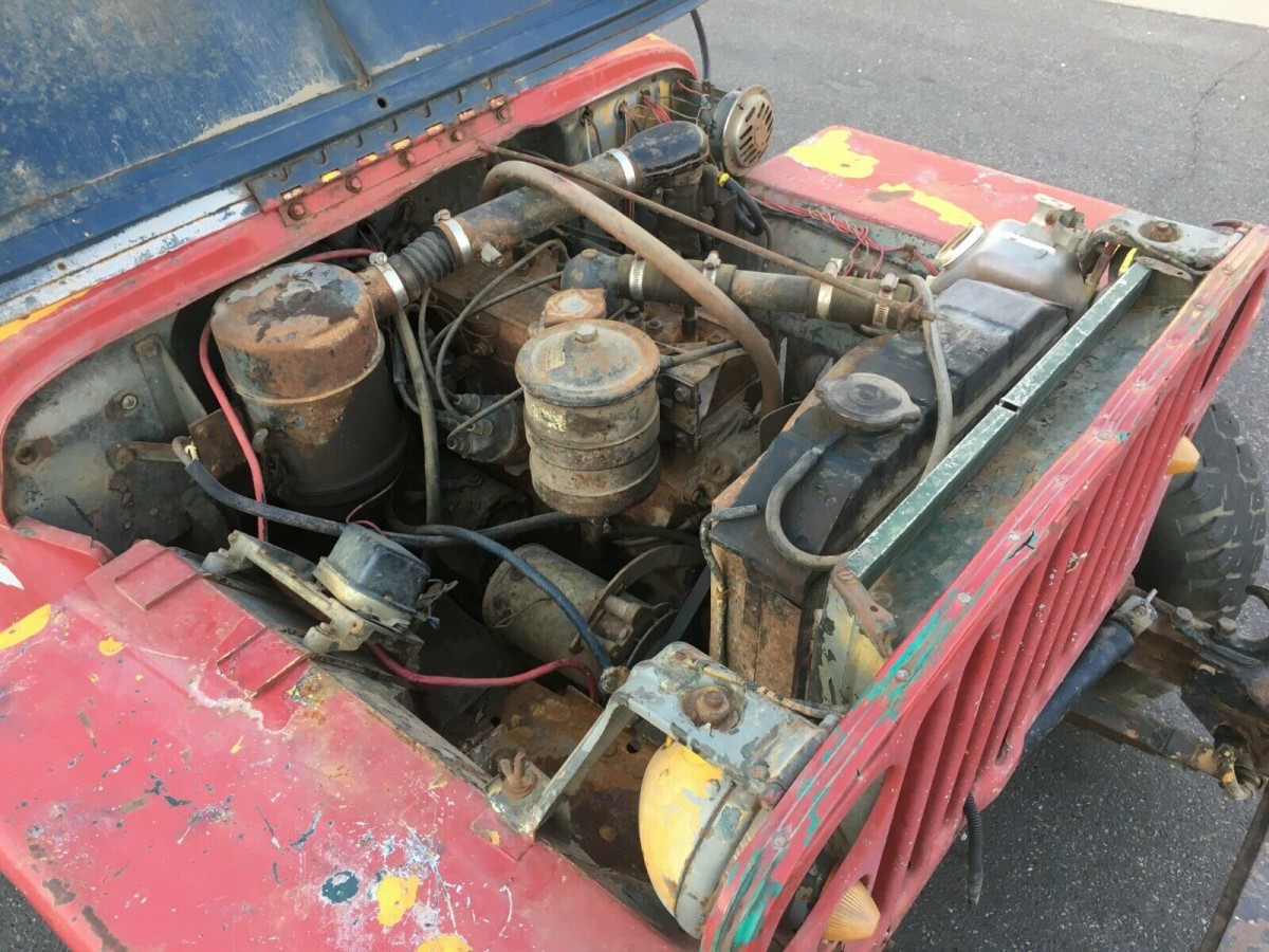 The seller says the body is quite solid, and from here, it does appear to not have major rot holes in it. The flat fenders look intact as well, and the Willys rides on OEM steel wheels. The body is covered in red paint with yellow poking through in more than one spot, along with the occasional bit of gray showing up as well. This is the type of vehicle you’d respray in your backyard.