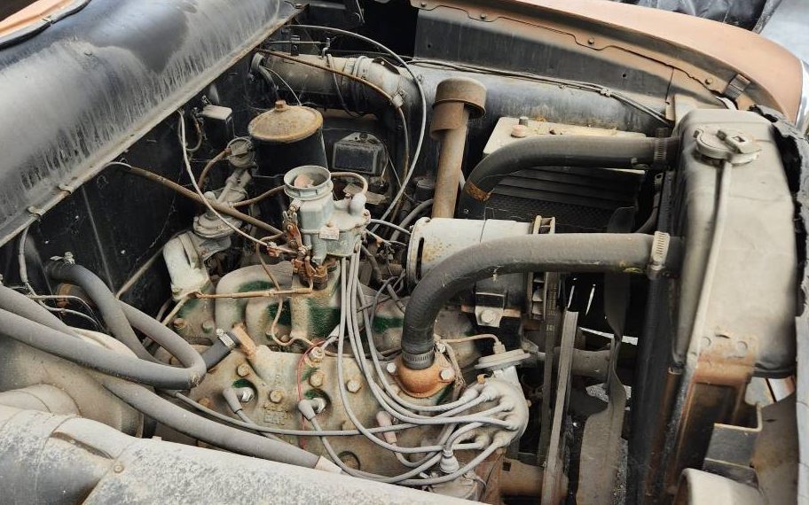 The 100 HP, 239 CI “flattie” V8 engine appears as if it hasn’t turned a lick in many moons. Minus the air cleaner, it looks like it’s all there but it would be nice to know if it will at least turn over by hand. A three-speed manual transmission was the only game in town for Ford 73 long years ago.