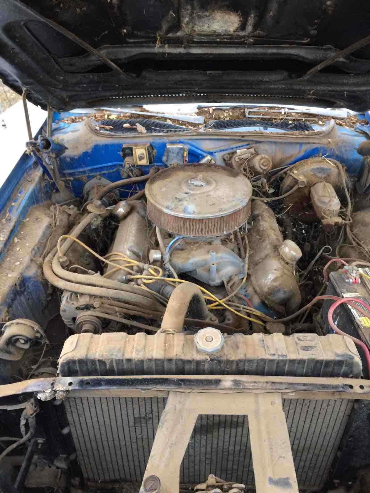 The car has the data plate H51 code for factory A/C, and the dash has the A/C controls & vents, but there is no evidence of any A/C equipment under the hood. So it’s a good chance the engine has been replaced with a non-A/C engine.