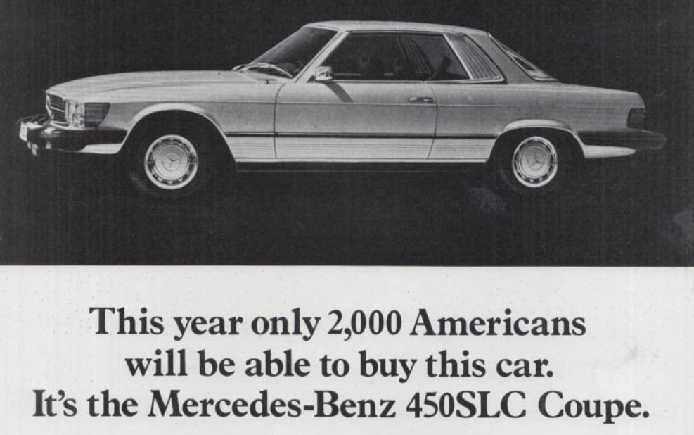 Now, the seller only includes the one photo of the Mercedes with its nose parked in the weeds – not exactly helpful. But it’s also dirt cheap and the seller is probably figuring someone hungry enough for a project will offer $1,500, which is a fair offer for one of these provided it’s not completely rusty. Being that it’s in Texas, there’s a good chance that, despite its unfortunate parking space, it’s still pretty solid. As this advertisement from 1974 points out, the company didn’t produce very many hardtop coupes, so it certainly seems rare enough to warrant saving. But this was also the point in time when R107s and C107s began to suffer from overly-aggressive emissions and safety requirements, negatively impacting both its looks and performance.