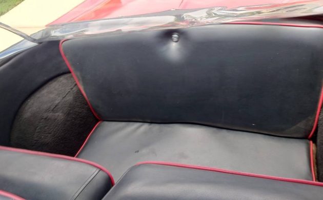 The Met’s custom interior is in good shape and looks sharp. The pleated black vinyl seats with its red piping trim is a nice contrast to the Canyon Red exterior and the door panels and carpet look great as well. It’s also wearing aftermarket black seat belts. Metropolitans were basically two-seater cars. Their rear “seat” was little more than a padded shelf and the trunk was accessed by folding down the rear “seat” back. It wasn’t the most convenient or practical design and rear trunk access wouldn’t be available on Metropolitans until the 1959 models.