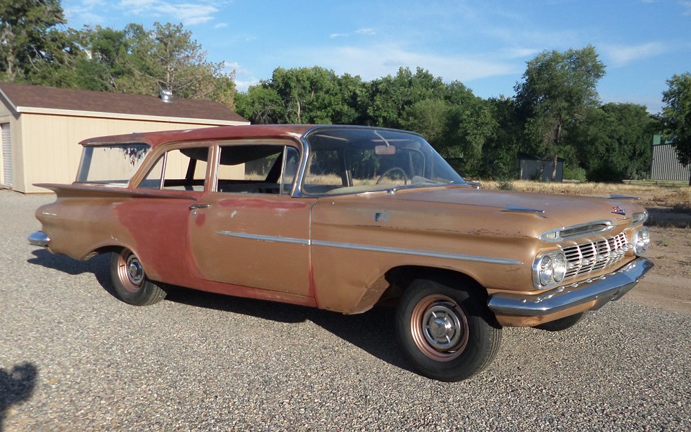 It looks more than solid in this photo, it looks fantastic! I can see why bidders are salivating over this blank canvas. The year before this beauty was made, in 1958, every seventh car made was a station wagon. That seems like a lot but I would venture a guess that pickups and/or SUVs are a much bigger ratio of non-sedans to sedan sales now. The two-door Chevy wagon would go away after 1960 and it remained in hiding until the ’64 Chevelle two-door wagon.