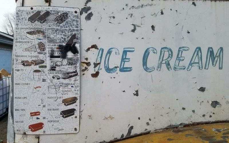 Here is a close up of the vintage ice cream menu. Too bad the weather has taken its toll and you can’t really read it too well. If the new owner is doing a period restoration, there’s enough information left to recreate it. Based on the fact that the roof is already gone, I would have a hard time not making it into a cool short-box roadster pickup. How about you?