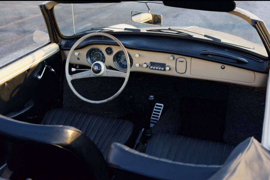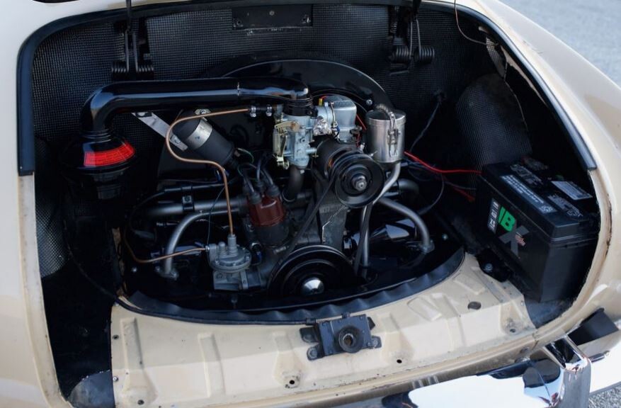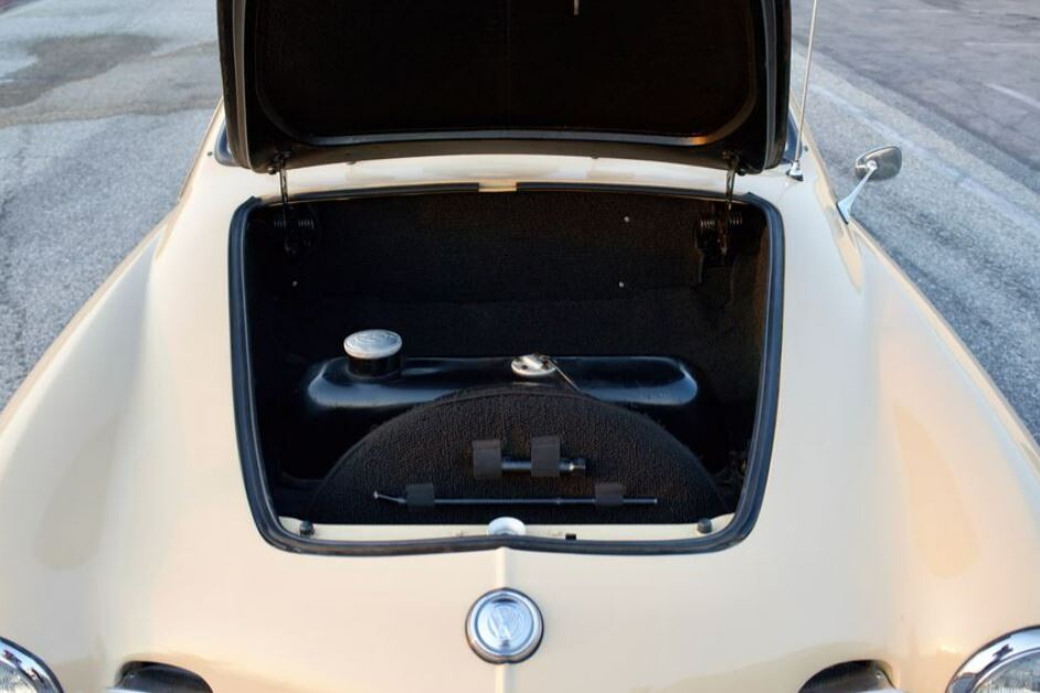 Not only is this car a rare individual, but it is also in beautiful condition. The ad does not say if restoration work has been performed, but we do know the car has a rebuilt 1.2 liter motor which should generate about 36 bhp. (VW celebrated the 30 to 60 horsepower rating of its 2+2 over time, running an ad at one point showing a Karmann Ghia decked in racing stripes with the caption, “You’ll lose.”) The car also was upgraded to a 12-volt system, received a 30-PICT-1 carburetor, and has a front disc brake conversion. The transmission is a four-speed manual.