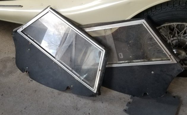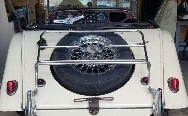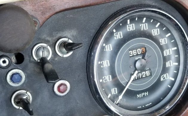 The seller says it’s a 1965. The Record indicates it was road tested in late 1965, then “despatched” in January of 1966. The car came back to the factory in 1967 to fix some accident damage, repair the chrome wire wheels (which were already rusting), add a tonneau, a new timing cover and oil seals.