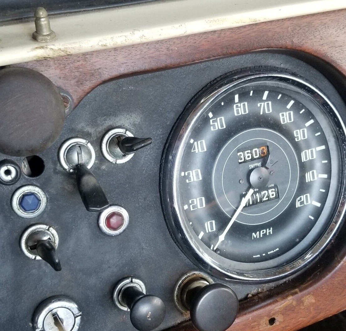 The seller says it’s a 1965. The Record indicates it was road tested in late 1965, then “despatched” in January of 1966. The car came back to the factory in 1967 to fix some accident damage, repair the chrome wire wheels (which were already rusting), add a tonneau, a new timing cover and oil seals.